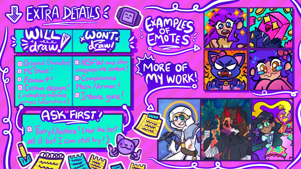▸Ask first: Furry/Anthro sonas (not the best at it but I'll try my best!), Gore (depends on the intensity of it), If you are unsure, just communicate it with me and we'll work something out!